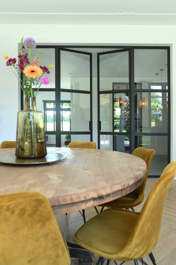 Dubbele stalen schuifdeuren met een prachtige uitstraling brengen het benodigde licht in huis. Met hun warme uitstraling geven ze de woning net dat beetje extra.